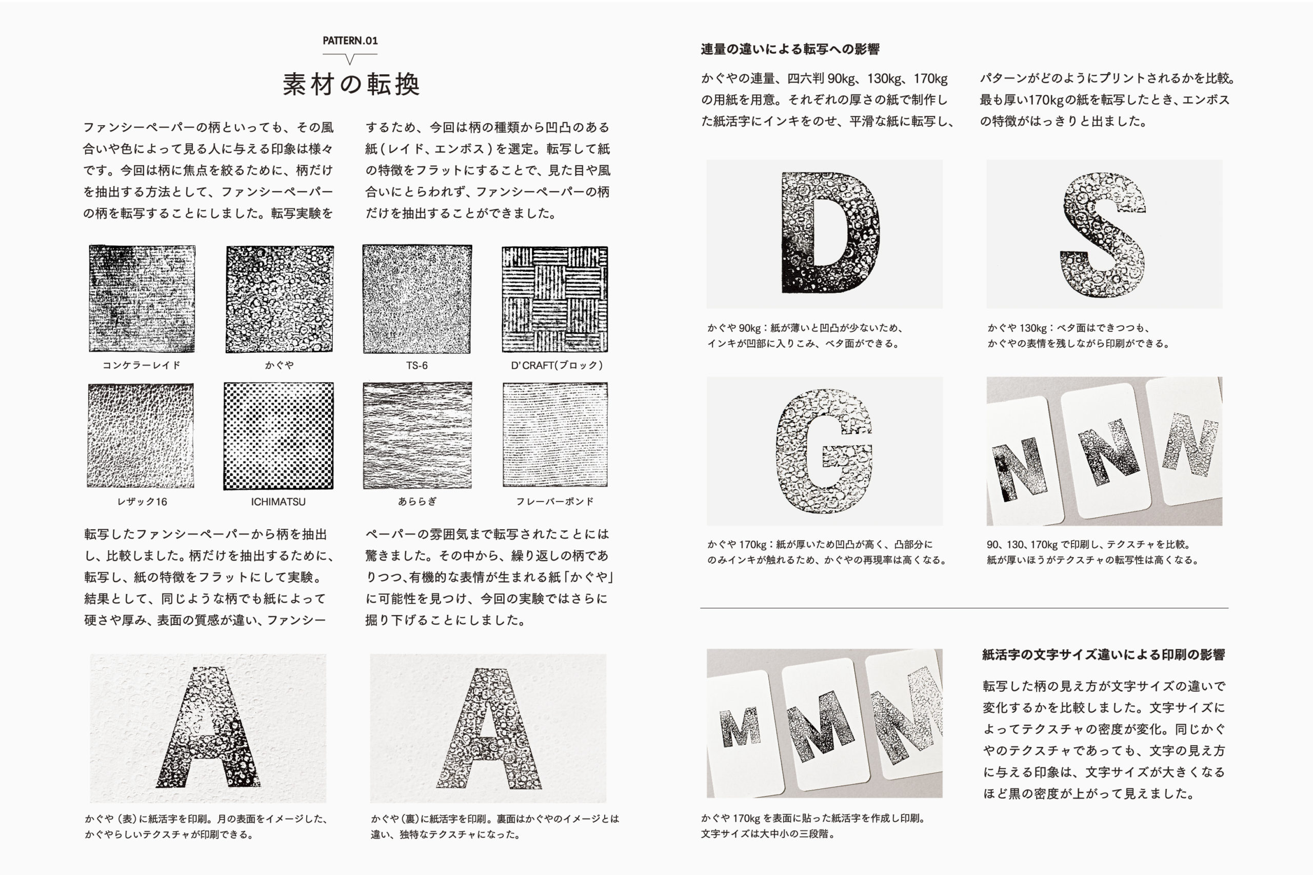Papertypeの表現を使って紙の持つ柄(エンボスペーパー)を紙に転写することで、紙の柄の凸凹度合いを客観的に見ることができます。月のクレーターをイメージした「かぐや」を選び、この表現の実験と制作を繰り返しました。転写した印刷物から版を作り、デボスしてあらたに紙を作り、紙の柄から拡張した表現の実験を行い、最終的にA!ポスターの完成に至りました。