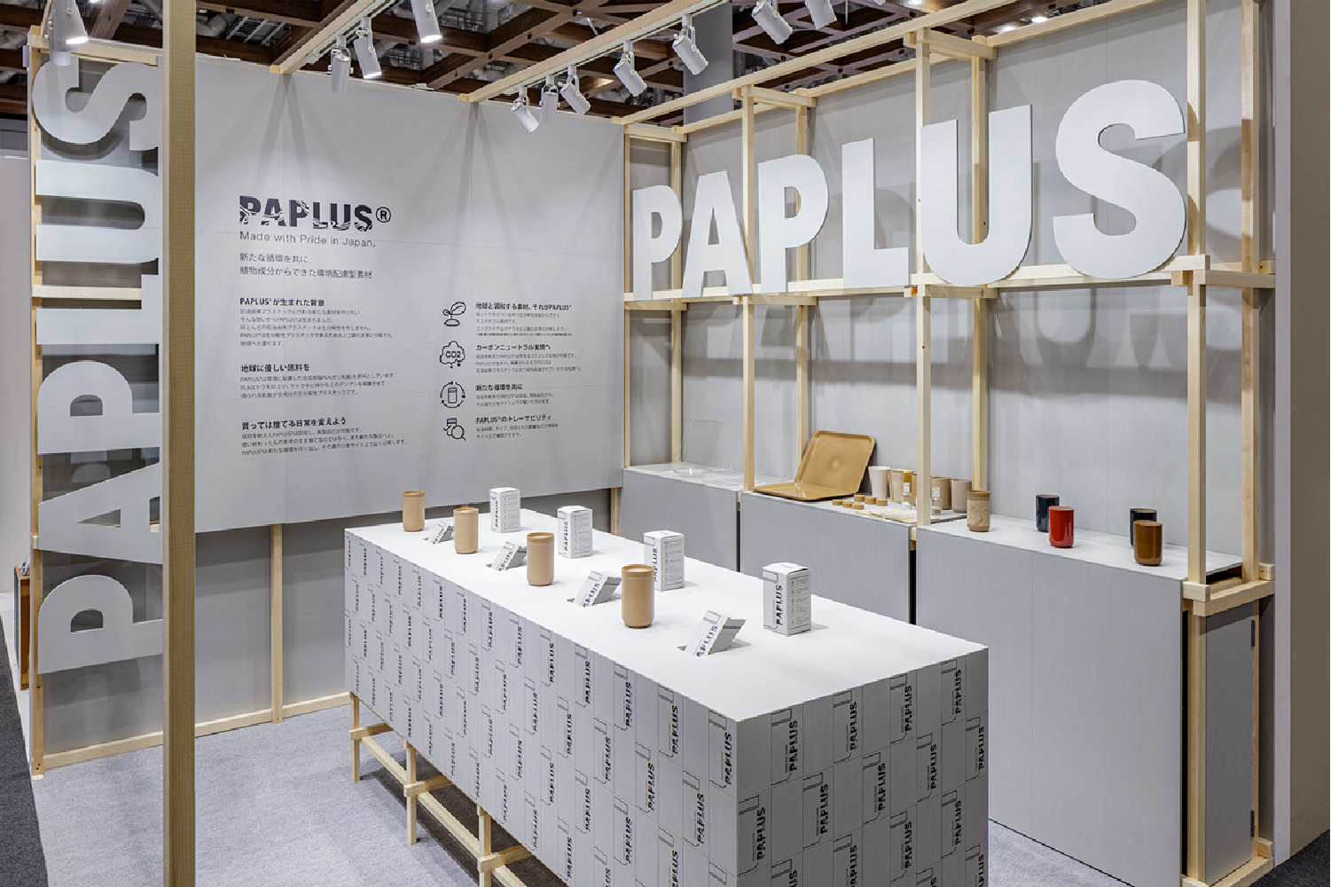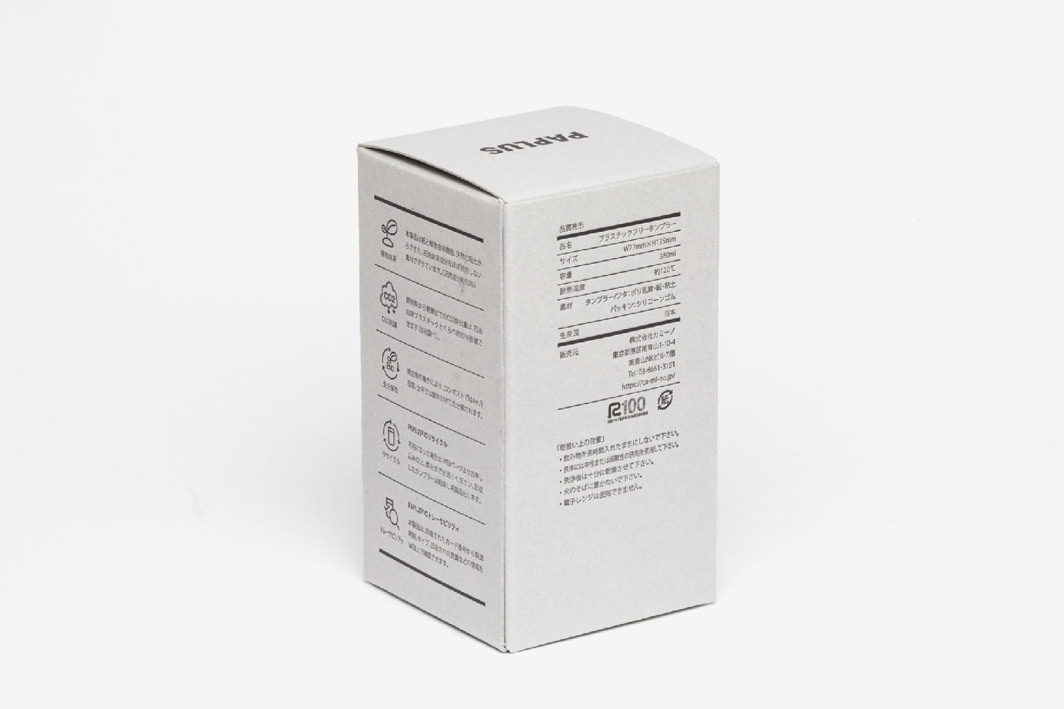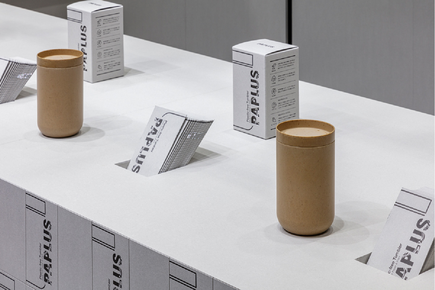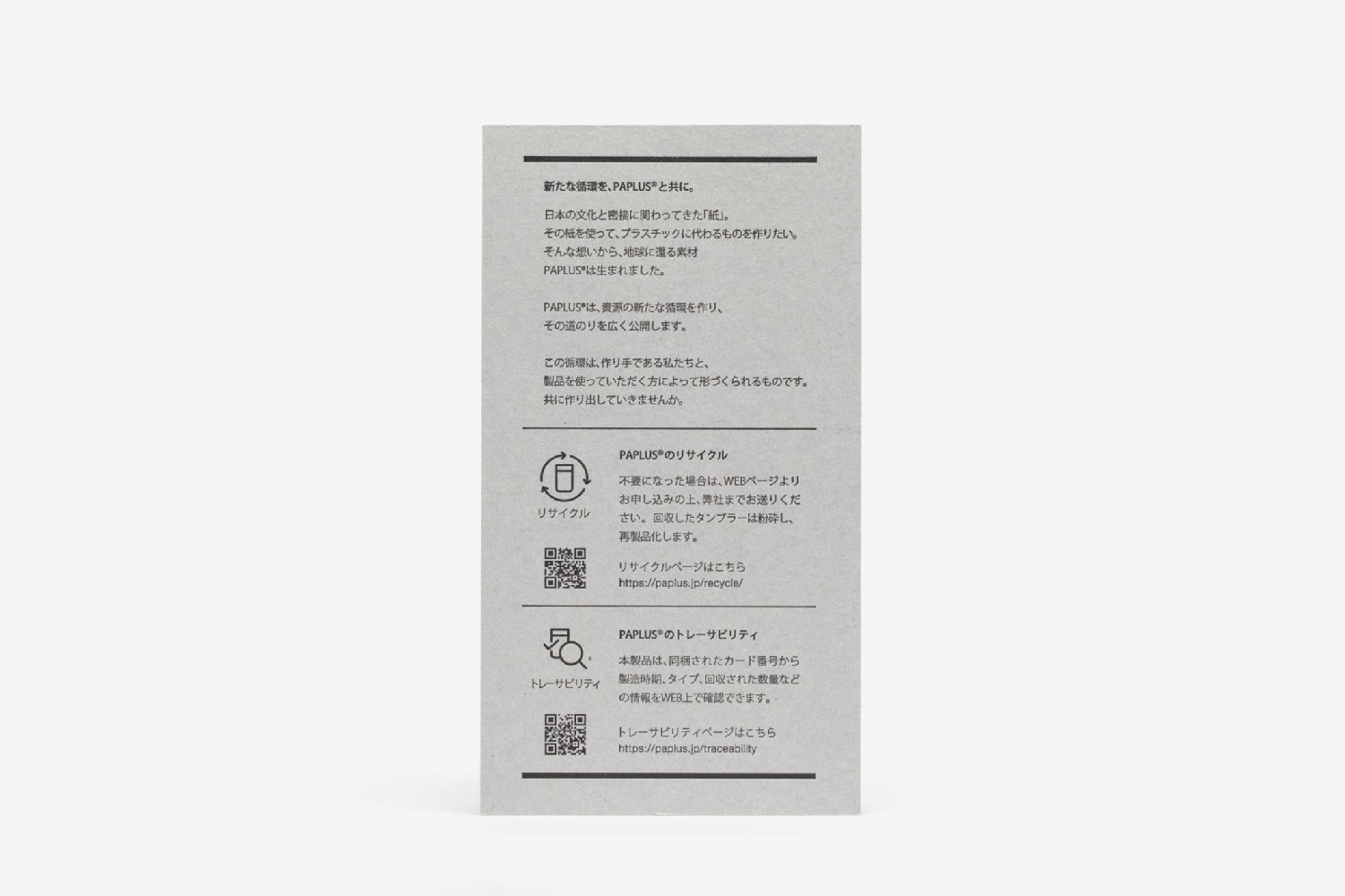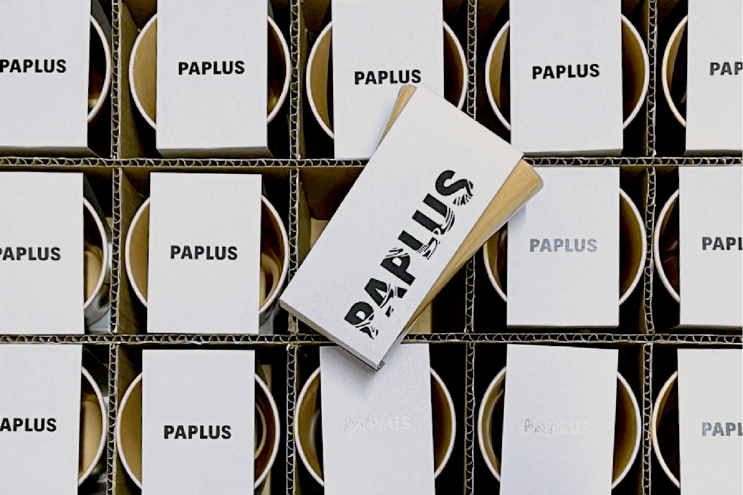 Paplusは、PLA樹脂と古紙を使った精分解する循環型素材を使ったカトラリー商品。循環型の商品にふさわしいパッケージとして、墨一色のデザインを採用し、古紙再生からできたチップボールをブランドペーパーに据えてブランディングを展開しました。環境配慮に特化しオフセットを使わず活版印刷で少量で生産し、それぞれにナンバリングすることで唯一無二性を生み出す工夫を施しています。その他、パッケージを基軸にカタログ、内装までチップボールを活用しています。